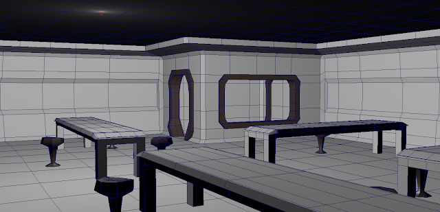 Todaay's focus was on my environmental assets.After some good headway made and lessons learned on the office and the first stages of the constructed biolab, I feel I was able to make serious headway with the other locations. I want to bring in a feeling of standardisation to the environment, so far I have approached this by sharing walls, ceilings and smaller elements like doorframes or wall motifs - everything intended to help the viewer understand this to be a single planned location.